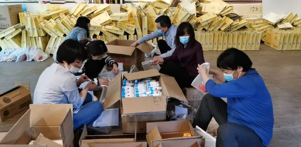 2020年5月6日,在西安交通大学大学机械学院职工之家,院办的老师们一起努力为归校而来的学子们准备返校以后需要用的的各种防护用品与物资。