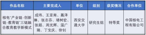 以西安交通大学“智慧核电”校企合作为契机,打造核电“产业链-创新链-教育链”三链融合教育教学新模式,产业链牵引创新链、创新链激活教育链、教育链服务产业链,三链贯通融合协同育人,并进行工程应用和推广:协同研发的“伏羲”核电智能决策工业软件已批量列装“华龙一号”机组,形成的标准规范在中核集团核电全产业链推广;研发的核电循泵智能运维系统,已推广于核电汽动给水泵、电动给水泵等,形成了国内首个智能运维国家标准和4项企业标准;三链融合教育教学新模式,已迅速内推中核集团其他校企联合体;校企联合体作为产教融合典范,在人民日报专刊头条和陕西日报头版头条报道,支撑了国家能源核电数字化智能化研发中心国家级平台和装备运行安全保障与智能监控国家地方联合工程研究中心建设。