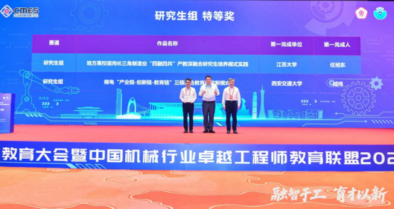 2025年9月19-21日,由中国机械工程学会、中国机械行业卓越工程师教育联盟主办的第二届“科德杯”中国机械行业产教融合教育教学创新大赛在广州召开。由航空发动机研究所教师牵头完成的作品——核电“产业链-创新链-教育链”三链融合教育教学新模式,在全国总决赛中表现突出,荣获研究生组特等奖。黄庆学院士为特等奖第一完成人成玮教授颁奖。