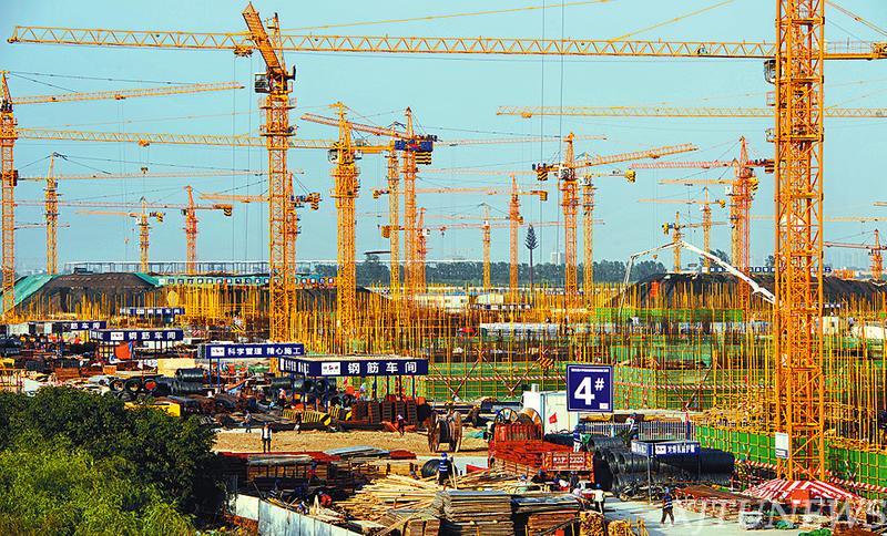 热火朝天的建设景象通过沈兰康列举的一串数字展现在记者前面:112台塔吊、96万立方米混凝土、13万吨钢筋、21万立方米砌块、216台大型机械设备、3万名建筑工人24小时3班倒不间断施工。