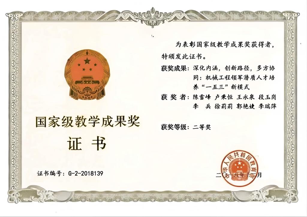 编我国首部智能制造国家职业技术技能标准(GZB20207132021年),“工程有限元与数值计算”教学团队获首届全国教学数字化大赛特等奖。持续向行业输送人才,典型如中物院、太行实验室、611所、航天一院、中电十四所、商、中船集团、中国航发集团等。以人才培养的鲜明特色和突出成就,陈雪峰教授和卢秉恒院士为主要完成人,2018年获得了国家级教学成果二等奖。