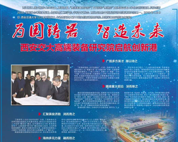 【陕西日报】为国铸器 智造未来——西安交大高端装备研究院启航创新港 西迁精神,薪火相传;百年交大,再谱新篇。“高端装备研究院”(下文简称“高端院”)是西安交通大学响应制造强国、科技创新2030、军民融合等国家战略,依托机械工程学院,学科交叉融合,首批成立的中国西部科技创新港研究院之一。2019年4月8日,西安交通大学123周年校庆日,作为西安交大首个进驻创新港的研究院,高端装备研究院正式启航!广揽多方英...